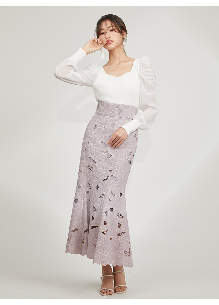 伸縮性のあるリブニットとシアーな布帛を組み合わせました。ベーシックカラーのホワイトとブラックに、女性らしい淡い色合いのピンク、ラベンダーを加えた4色展開です。