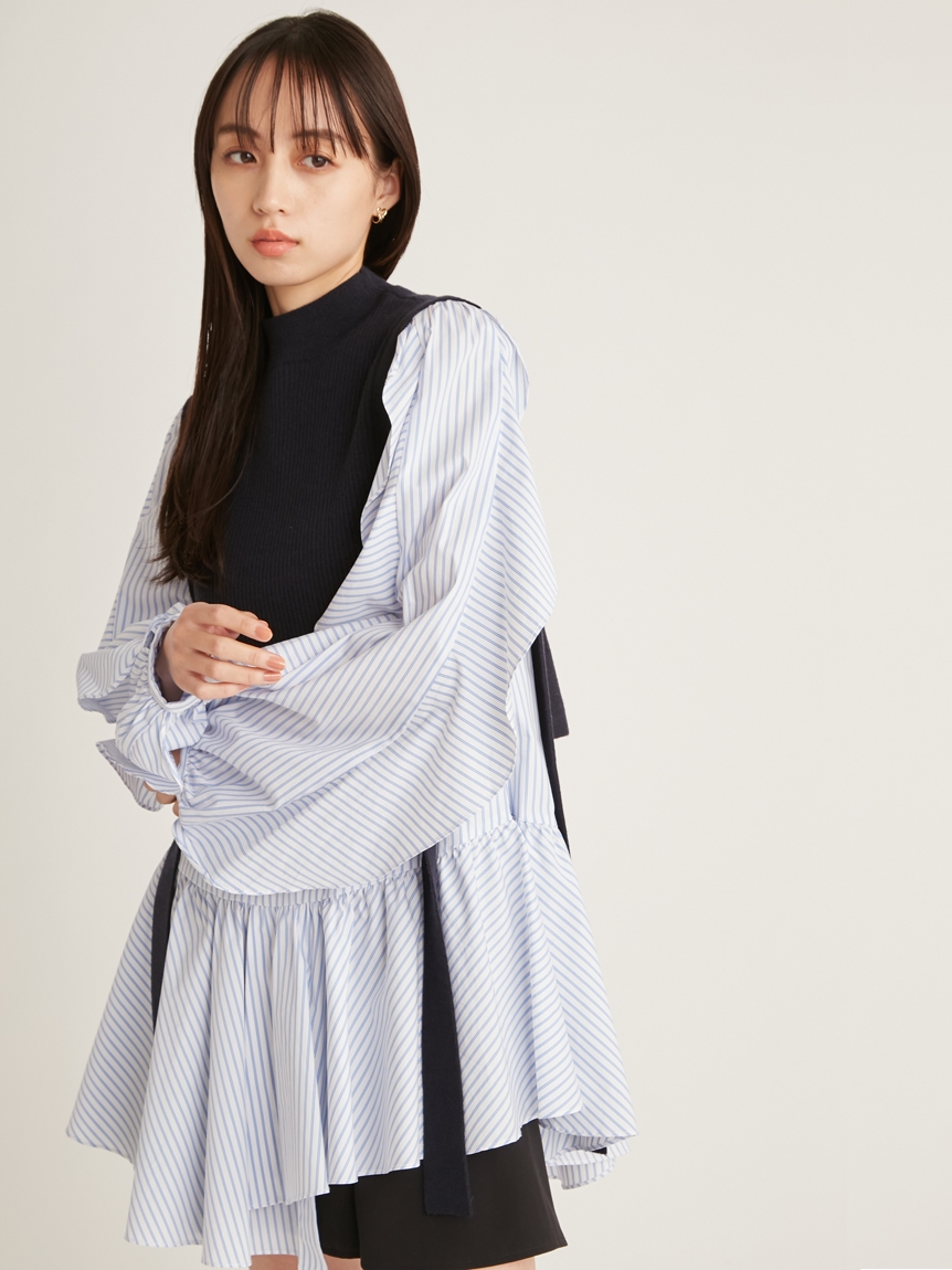 大胆な袖のフリルが目を引くチュニックブラウスにニットベストを組み合わせたセットアイテム。これだけで今年らしいレイヤードスタイルが完成する優秀アイテムです。アシンメトリーなヘムデザインで、フェミニンな中にモードなエッセンスをプラス。それぞれ単品でも活躍してくれるので、コーディネートの幅は一気に広がります。