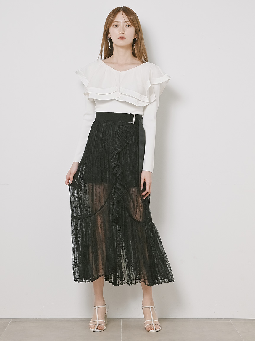 オーガンジーで切り替えたフリルカラーが目を引く、女性らしくエレガントなニットプルオーバー。フリルにはサテンパイピングを施すことで表情を引き締めています。身頃部分はシンプルにすっきりと仕上げることで、メリハリのとれたバランスの良い仕上がりに。パンツともスカートとも合わせやすく、幅広いスタイリングに活躍してくれます。