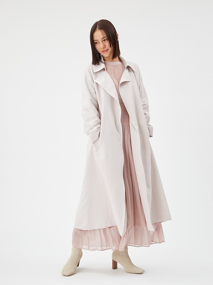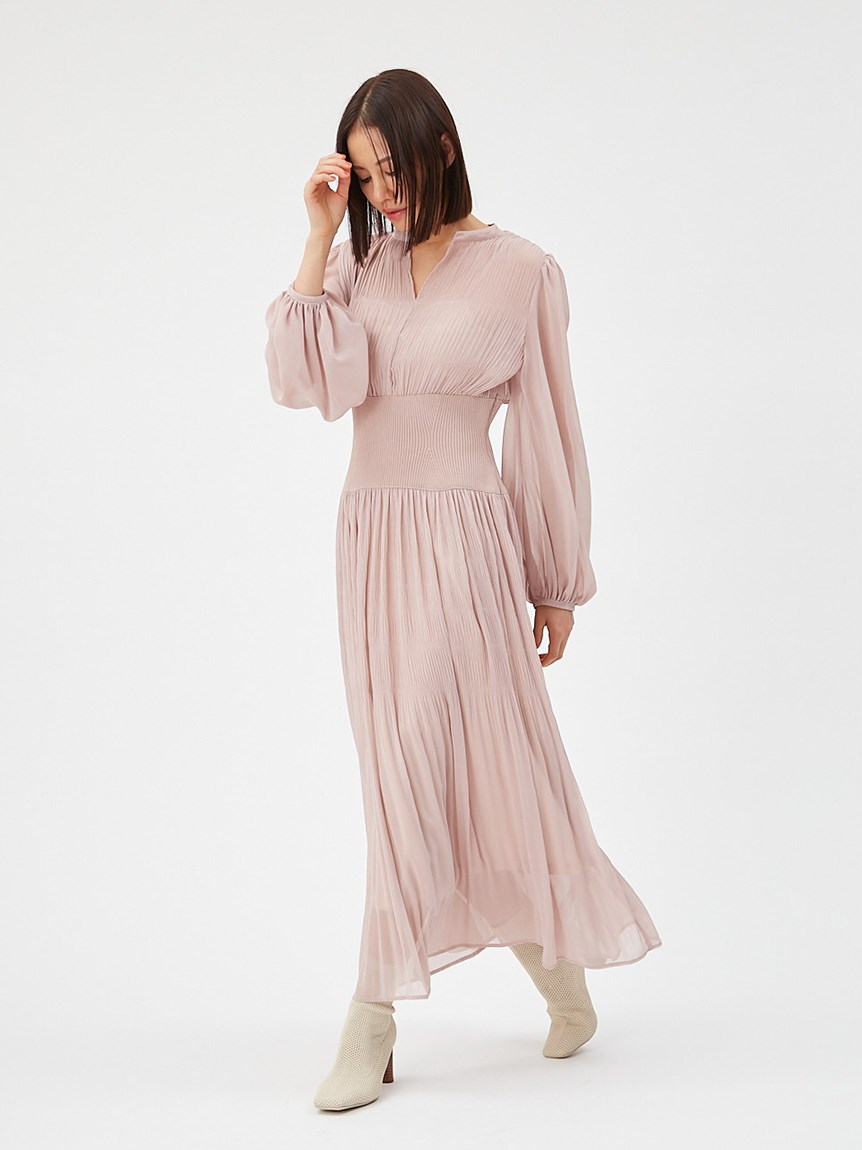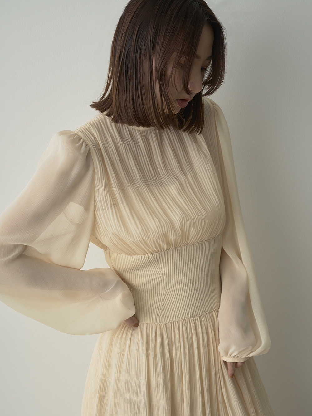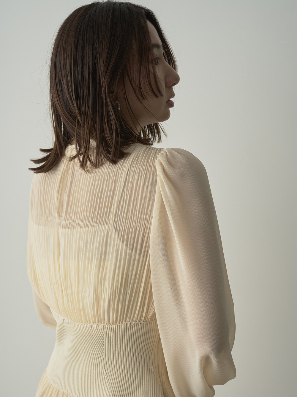 ランダムに細かく、ふんわりとした優しい触り心地のマジョリカプリーツを全体にあしらい、女性らしい上品なスタイルに。