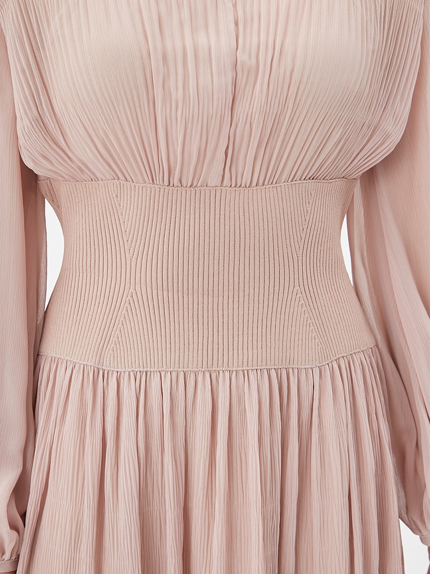 ウエストラインをきゅっと締めたワイド幅のリブ編みと、スカート部分は柔らかいシフォン素材の軽やかに広がるラインがシルエットを美しく見せ、1着でスタイルアップを叶えます。