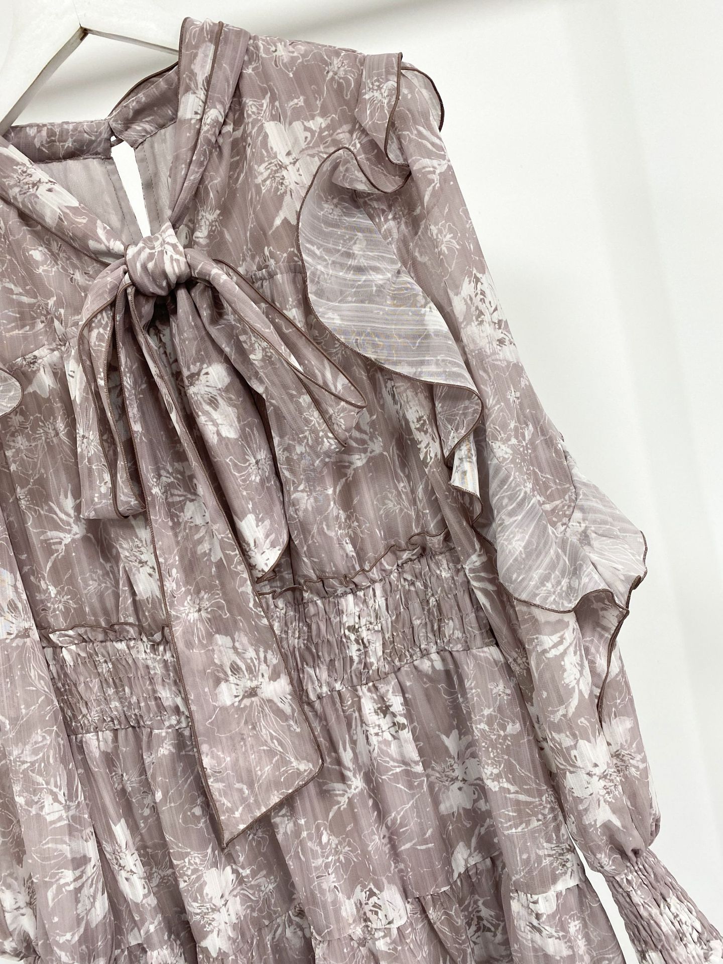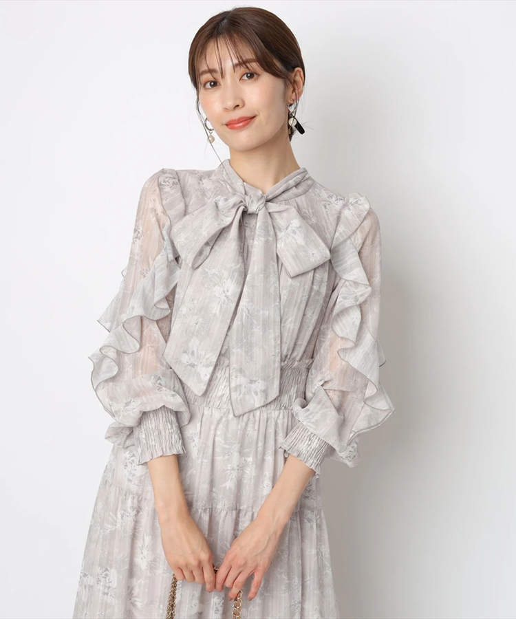 ラッフルフリルをあしらったシアーなスリーブも女性らしさを引き立たせます。華やかさをプラスするボウタイは取り外しが可能なので、アレンジが楽しめるのも嬉しいポイント◎