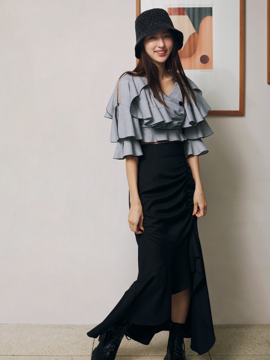 フロント部分に効かせたシャーリングが印象的な、女性らしさ溢れるマーメイドスカート。イレギュラーなラインを描くヘムには深めにスリットを入れ、ヘルシーな肌見せを演出しています。存在感のある華やかなルックスなので、シンプルなトップスを合わせてもサマになる1着。同シリーズのブラウス(SWFB231140)と合わせたワンピースライクなスタイリングもおすすめです。
