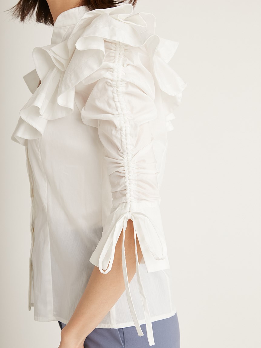 たっぷりのフリルでボリュームを出した、王道フェミニンなブラウス。甘くなり過ぎないよう太めの見返しやカフスでモード感を引き立てています。袖にはドロストディテールを落とし込み、ギャザーの分量で表情のアレンジが可能に。1枚で華やかに決まりシルエットもすっきりとしているので、ボトムを選ばず幅広いコーディネートを楽しめます。