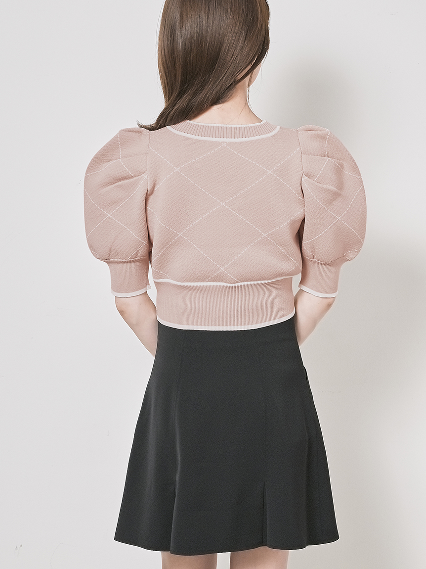 トレンドのクロップド丈を採用した、プラスワンでスタイリングの鮮度が高まるニットプルオーバー。たっぷりとボリュームを持たせたパフスリーブでモードな印象に。バイカラーデザインとカーディガンのようなフロントデザインに金縁ボタンが今年らしいレトロなムードを演出しています。裾&袖口を幅広のリブで切り替えたメリハリシルエットでスタイルアップ効果も抜群です。