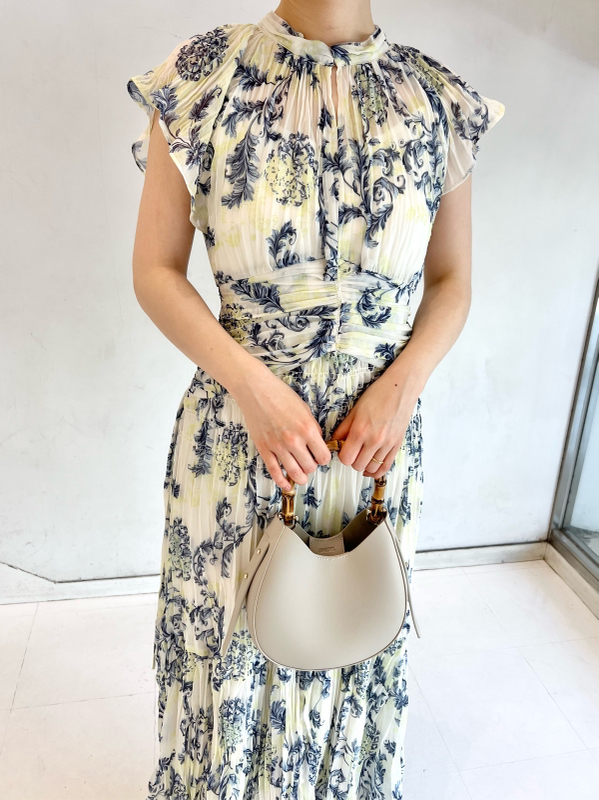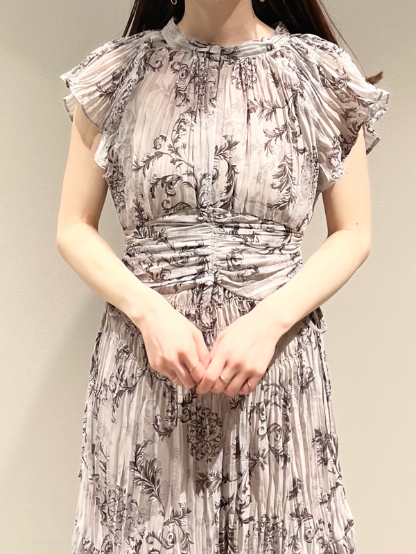 オリジナルのオーナメントプリントを浮かべた、春ムード薫るワンピース。全体にプリーツをふんだんに施すことで華やかさが高まり、主役級の存在感を放つ1着です。ウエスト部分にコルセットのような切り替えを入れ、スタイルアップ効果の高いメリハリシルエットに。バックウエストのレースアップで絞り方を調節でき、シルエットの変化も楽しめます。