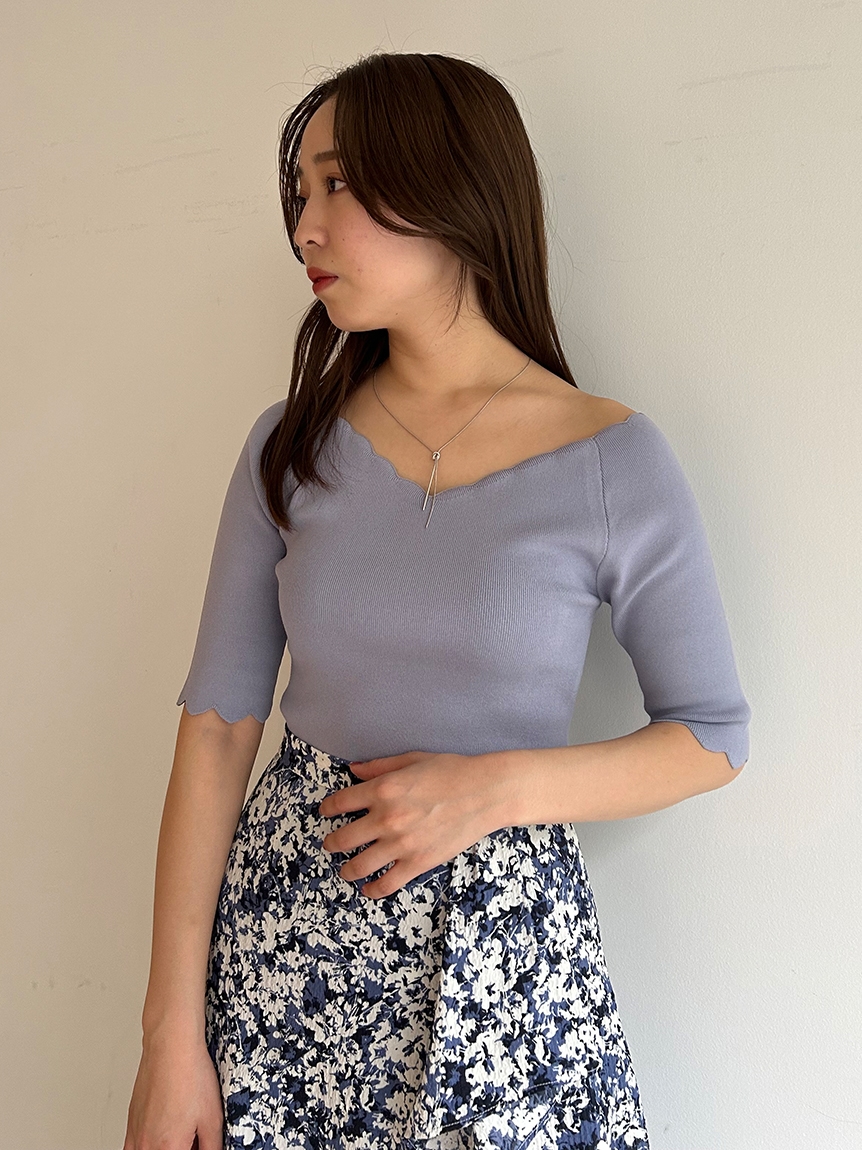 スカラップカットした襟ぐり&袖口が特徴的な、シンプルながらも女性らしさを感じさせるニットトップス。広めに開いたネックラインでヘルシーに肌見せでき、トレンド感をプラスしました。ボディラインを美しく見せるタイトシルエットも◎。スカートからパンツまで幅広いボトムと合わせやすく、着まわし力も抜群です。