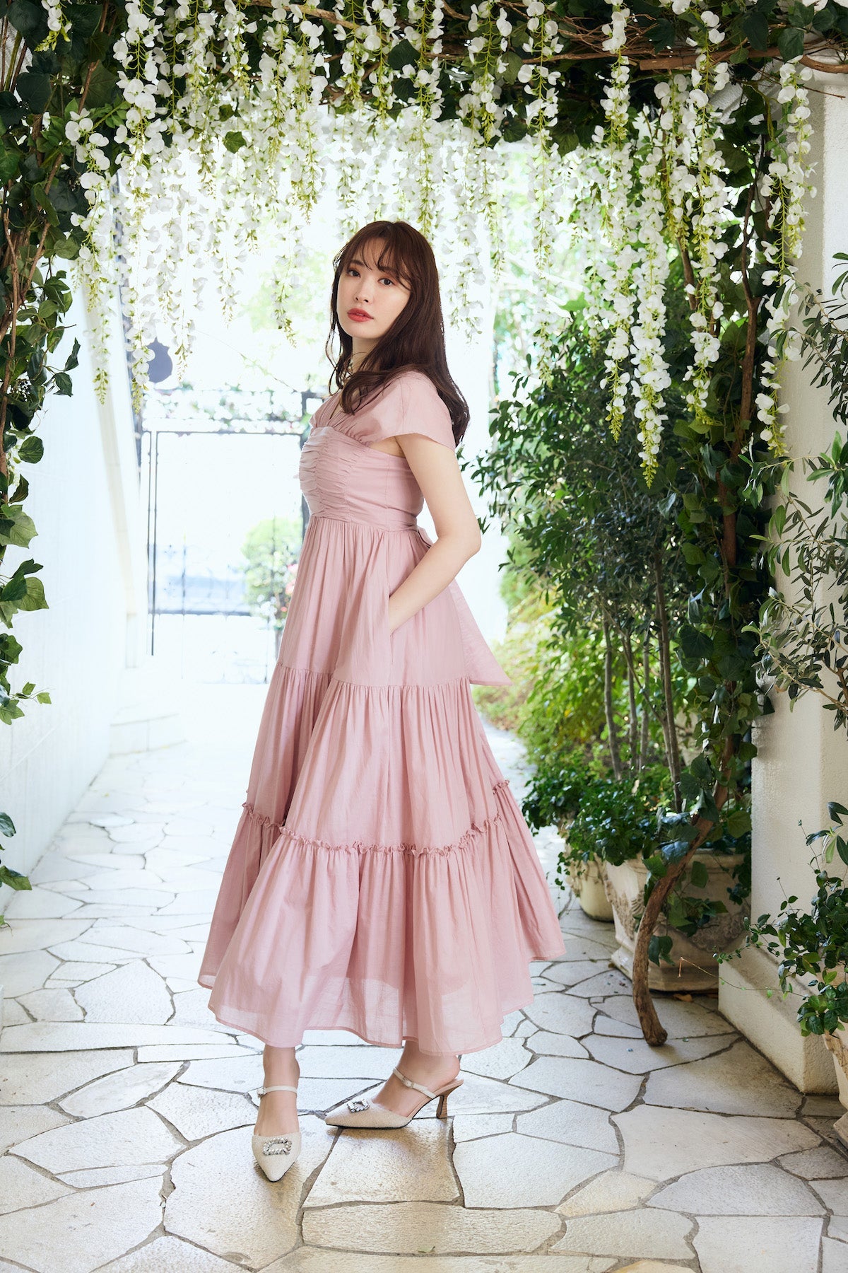 スカートに配した分量感たっぷりの二段のティアードが、裾に向かってふわっと広がり優美で華やかなシルエットを演出してくれます。