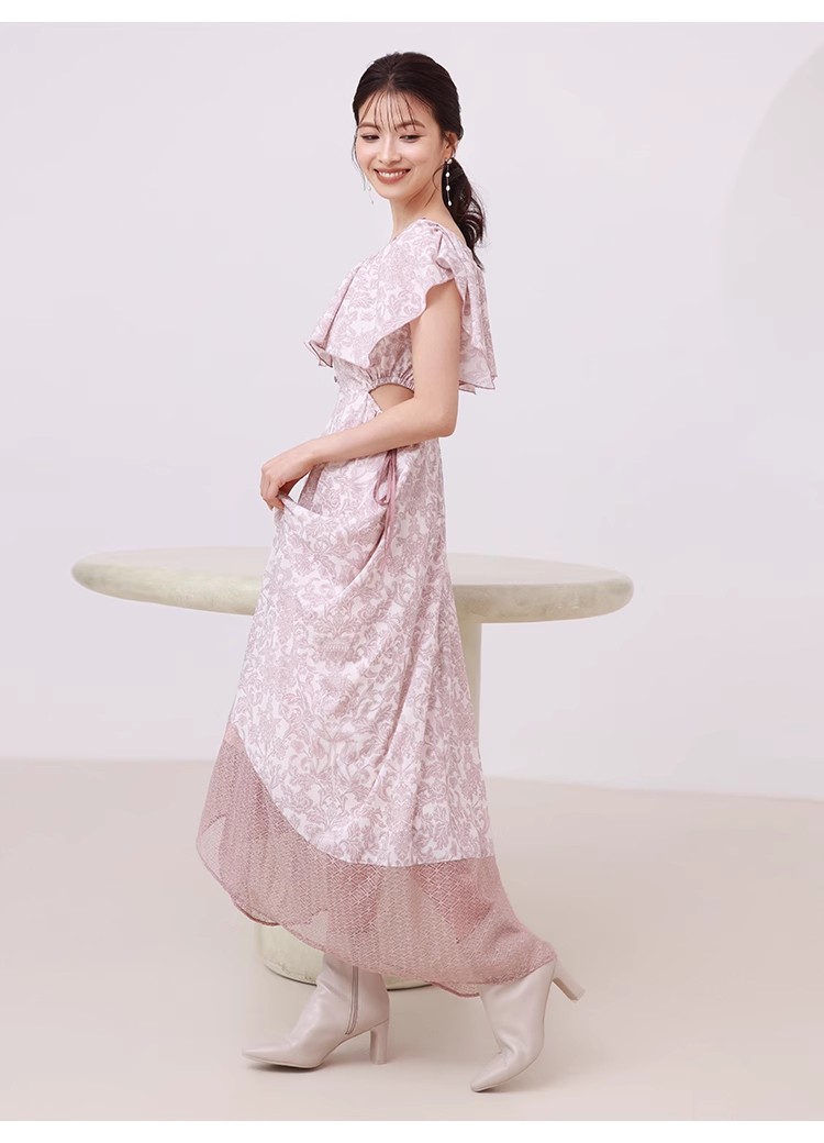 大胆なカットアウトやシアーなレースの切り替えでヘルシーな肌見せを演出する、トレンド感溢れるワンピース。「SNIDEL」オリジナルで柄を起こしたプリントを施し、華やかに仕上げました。襟ぐりにあしらわれたボリュームのあるフリルで、女性らしさはさらに加速。カットアウト部分はドロスト仕様なので、ギャザーの分量で肌見せの調節も可能です。