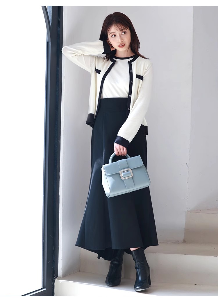 オフィスルックにぴったりな、洗練ムード漂うカーディガンとノースリニットのアンサンブル。バイカラーデザインを落とし込むことでぐっとクラシカルに。カーデはジャケットのように肩掛けしてもバランスが取れるようにスクエアめのフォルムに仕立てました。それぞれ単品でも着用できるので、コーディネートの幅が一気に広がります。