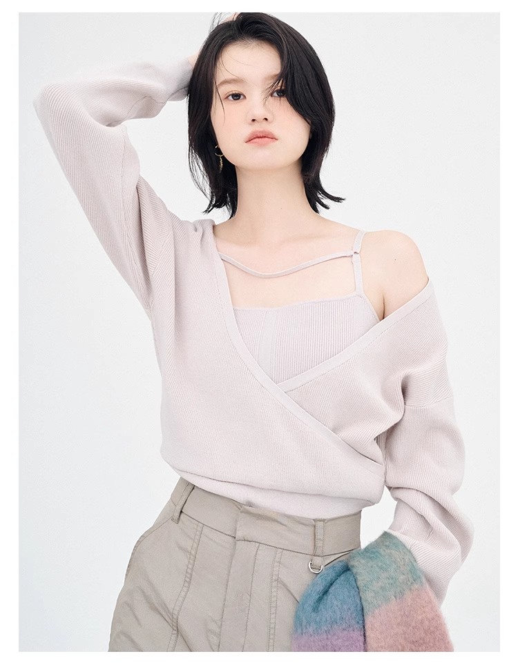 女性らしいカシュクールデザインにキャミソールをドッキングしたニットトップス。表のニットは内側でキャミソールに留めているので、肩を少し落とした着こなしでも袖がずれ落ちてこないので安心して着用頂けます。キャミソールのデコルテにはランジェリー風のディテールを落とし込み、コーデに合わせるだけでこなれた雰囲気に。ウエストは太めのリブ切り替えできゅっと引き締めスタイルアップへと導きます。