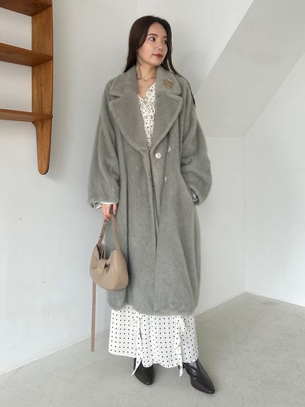 季節感が一気に高まるシャギーコートは、今年のトレンド。柔らかく繊細な毛流れが優美に映え、女らしさを高めてくれます。膝が隠れるくらいの程よいレングスのコクーンシルエットで、後ろから見たときのボリューム感も印象的。袖にも贅沢に生地を使用することで、たぷっとした愛くるしいフォルムをメイク。仕上げにオリジナルロゴのブローチを付け、ワンポイントに。ブローチは取り外し可能なので、お手持ちのコートやニットなどにもお使いいただけます。