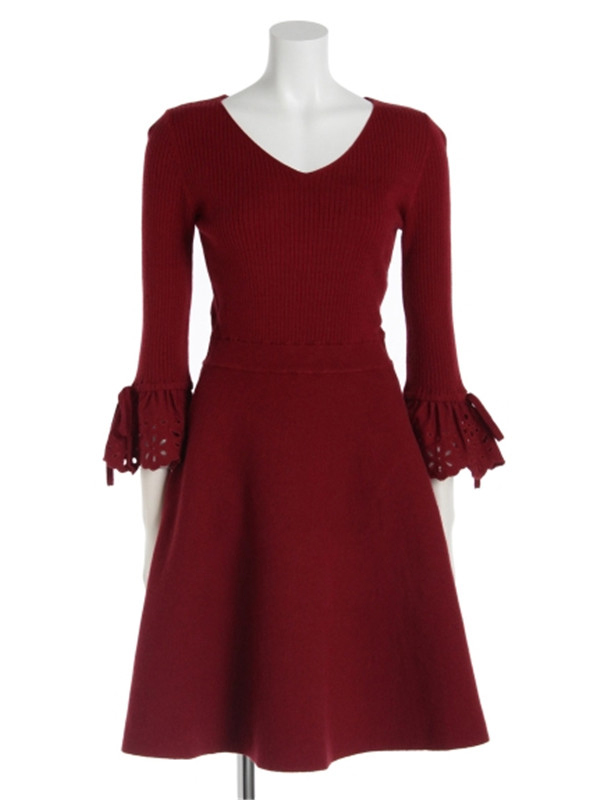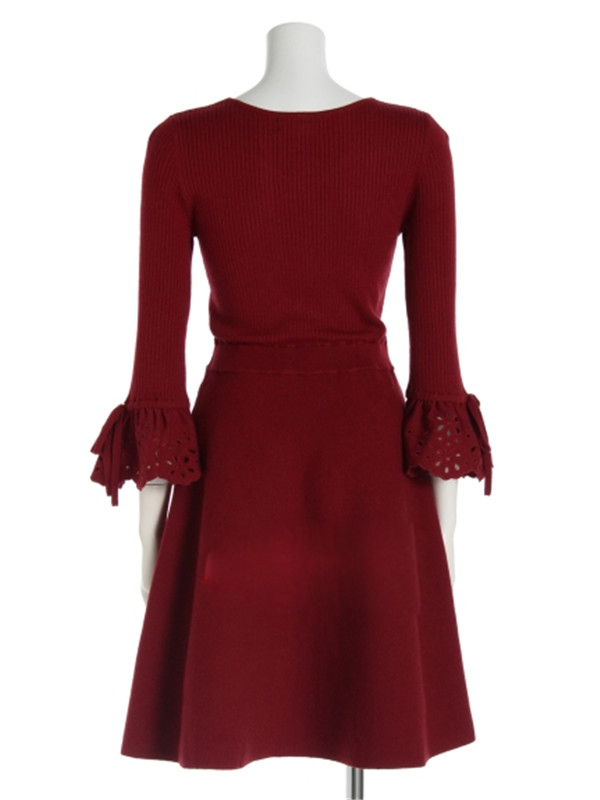 カットワーク刺繍入りのフレア袖に大人かわいいムードが漂うニットワンピース♪上身頃をリブ編みでコンパクトにデザインしており、スッキリとした印象に。ぐっと広く開いたVネックは、アクセサリーなどの小物も良く映えます。 素材 本体:アクリル40%、綿32%、ナイロン28%/刺繍糸:ポリエステル100% サイズ表記 総丈 肩幅 袖丈 袖ぐり バスト ウエスト ヒップ F 87.5cm 34.5cm 47cm 36cm 70cm 64cm 107cm